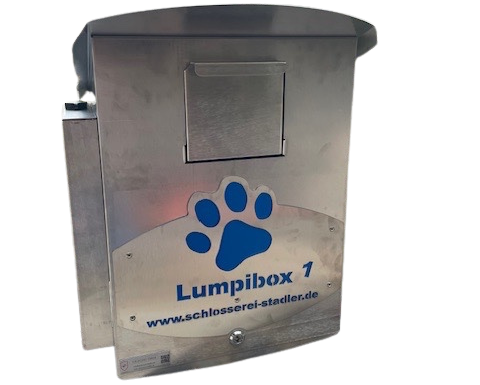 Komplett aus Edelstahl, Robuste Qualität aus 1,5mm Blech, mehrfach gefalzt und stellenweise aufgedoppelt. Ansprechendes Design und klare Erkennbarkeit für Hundebesitzer. Wasserdicht vernietet und mit großem Dachüberhang um Wasser und Eis aus der Box fern zu halten.
