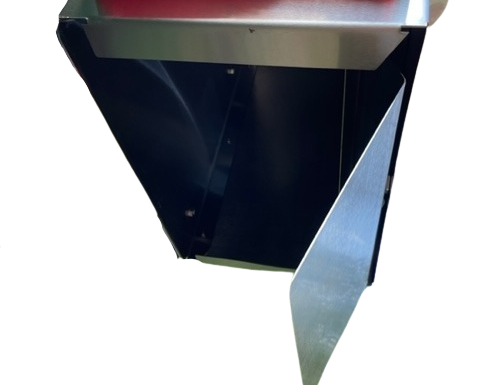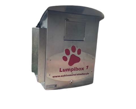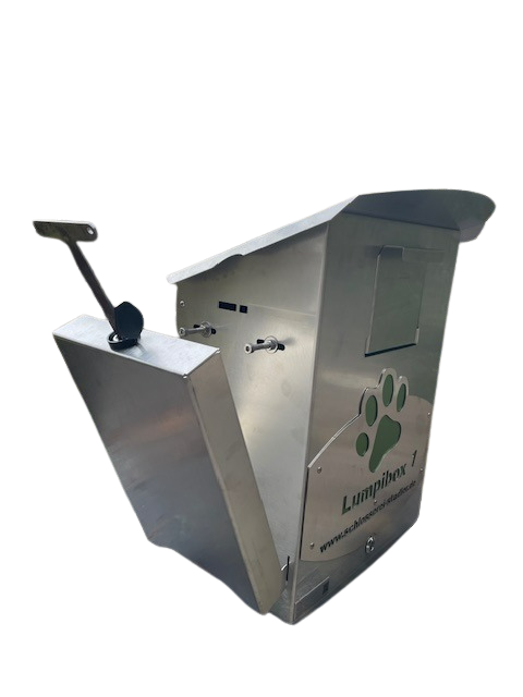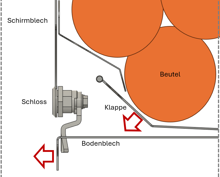 Das Schirmblech leitet die Kotbeutel am Schloss vorbei und überlappt die Klappe. Die Klappe bildet einen Spalt zum Bodenblech, welches so auch bei starker Bewitterung die Nässe von den Beuteln fern hält und gleichzeitig wenig Kontaktfläche für Eis bietet. Daher geht diese Box auch im Winter auf!